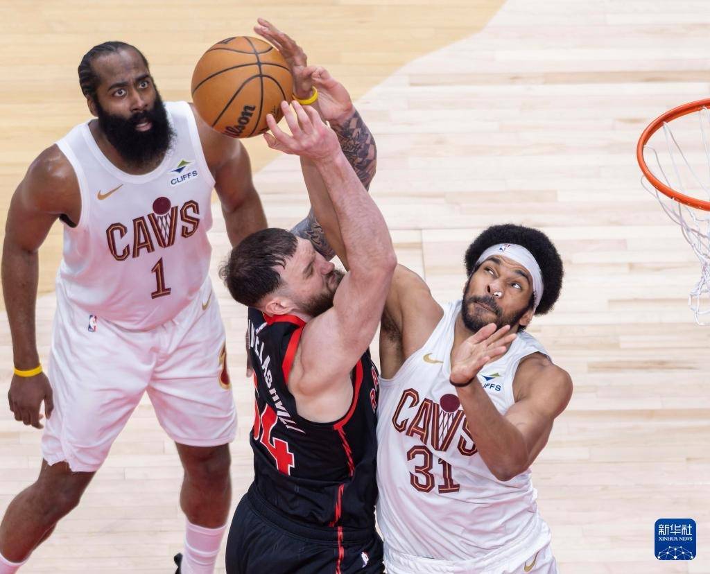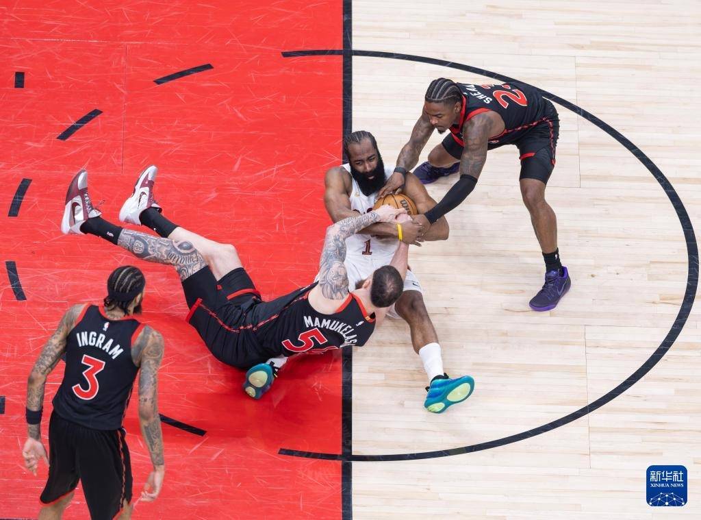 4月23日,骑士队球员哈登(右二)与猛龙队球员谢德(右一)、马穆凯拉什维利(左二)在比赛中拼抢。