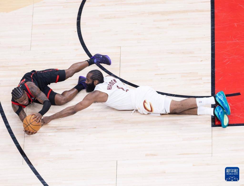 4月23日,骑士队球员哈登(右)与猛龙队球员谢德在比赛中拼抢。
